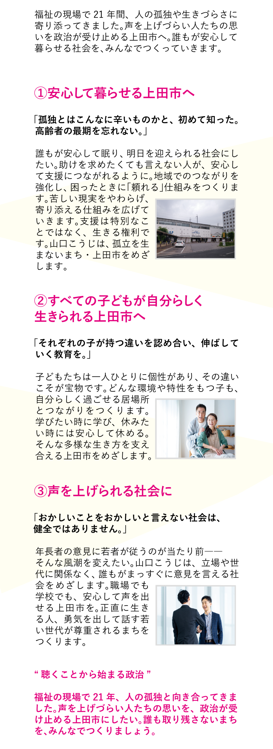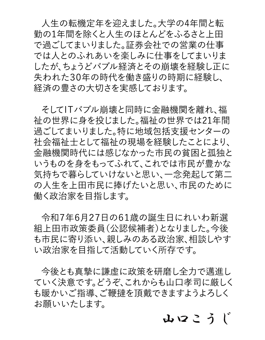 お寄せいただいたご意見やご感想は、山口こうじが拝見し、今後の活動や政策立案への参考にさせていただきます。